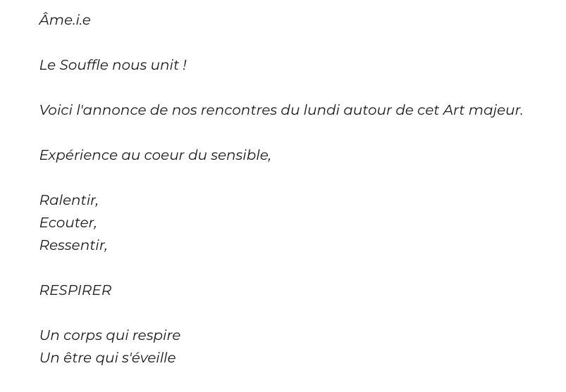 °) S’adosser et échanger avec lui directement dos à dos ou encore en créant un circuit d’énergie : la main gauche dans le dos contre lui et la main droite devant le plexus solaire, région digestive, la main gauche réceptrice et la main gauche émettrice, respirer plus longuement…. sentir et ressentir….